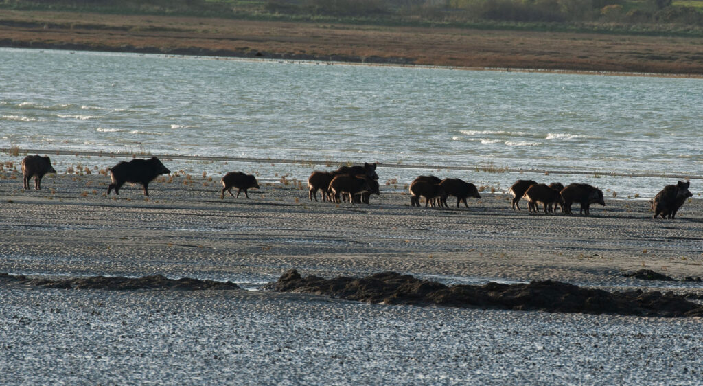 La vedette du jour fut sans conteste la compagnie de 17 Sangliers d’Europe (Sus scrofa) observée sur l’estran, et nageant dans la baie. Une petite vidéo a été enregistrée en digiscopie, et rangée sur YouTube la montrant en action, laies et marcassins.