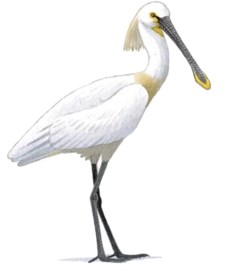 Deux Spatules blanches (Platalea leucorodia) tentèrent de disputer la vedette au Suidés. Platalea vient du mot grec platè qui désigne la surface large et plate d’une extrémité (d’une rame, d’un bâton, de la queue, des pattes ou d’un bec) et qui, ici, s’applique à la forme plate si particulière du bec. D’où spatule, sorte de cuiller plate. Beaucoup de langues ont nommé l’oiseau avec des mots formés avec le terme signifiant « cuiller » : anglais (Spoonbill = bec en cuiller), allemand (Löffler dérivé de Löffel), néerlandais (Lepelaar issu de lepel), portugais (Colhereiro-euro- peu/colher), suédois (Skedstork/sked), norvégien (Skjestork/skje), danois (Skestork/ske). Dans Rabelais (Le Quart Livre, 59), on trouve Pochecullière, dans lequel on retrouve la cuiller et la poche du pélican (confusion des deux oiseaux). Rabelais la nomme aussi Palle (pelle).