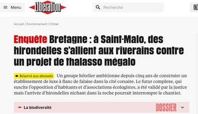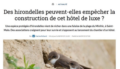 Marie Bonnisseau – journaliste et collaboratrice régulière de l’émission 28 Minutes diffusée sur Arte – s’intéresse à un projet de thalasso de luxe à Saint-Malo qui suscite l’opposition des riverains et d’associations écologistes, qui pourraient avoir gain de cause grâce à des… hirondelles. Un dossier que suit depuis quelques mois notre antenne !…