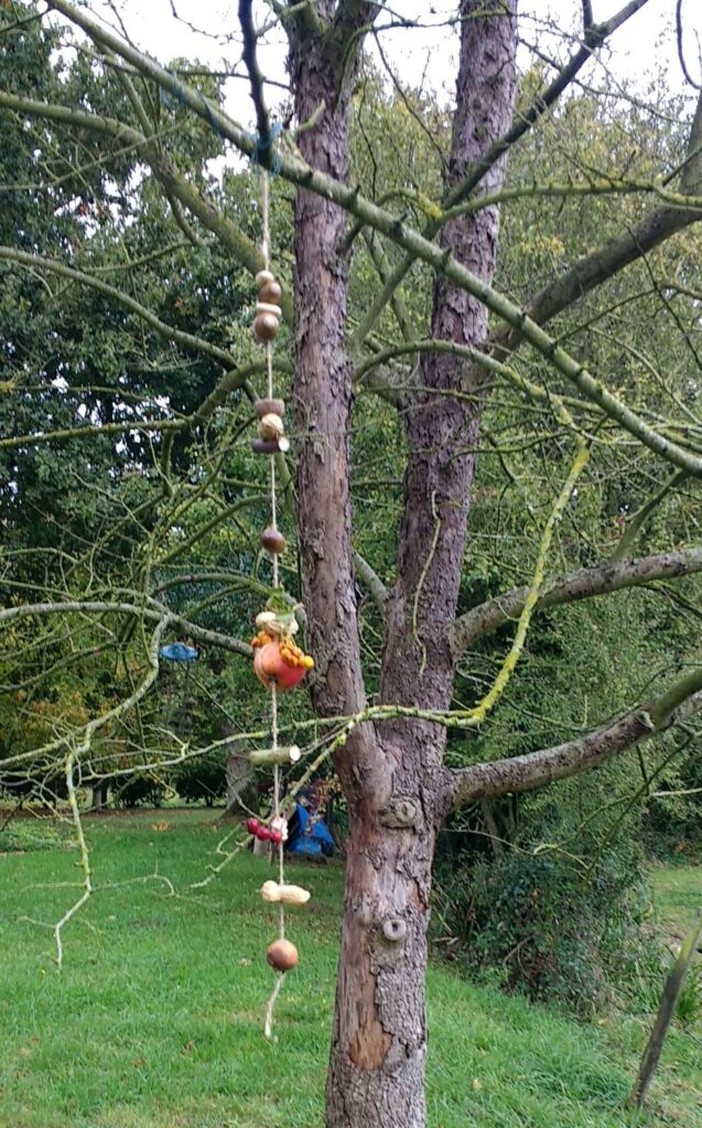 - Des suspensions à la fois artistiques et utiles, puisque destinées à être accrochées à des branches d’arbre et à nourrir les oiseaux ! Sur les conseils de plus expérimentés que moi, j’ai veillé à mettre une cacahuète juste au-dessus d’une petite branche de sureau : ainsi l’oiseau pourra-t-il s’y poser et déguster tranquillement sa cacahuète !