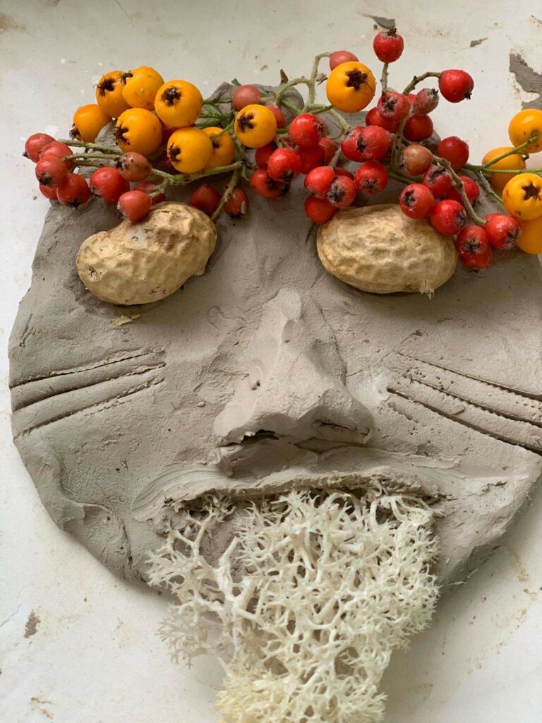 glands – cacahuètes – haricots secs, blancs et rouges – petites pommes – graines de courge – cupules de glands – fragments de branches d’aubépine avec fruits – morceaux de branches de sureau – fruits de pavot – perles de bois – galles du chêne – touffes de lichen, petites pommes de pin, tranches de pommes séchées… Et j’en oublie sûrement !