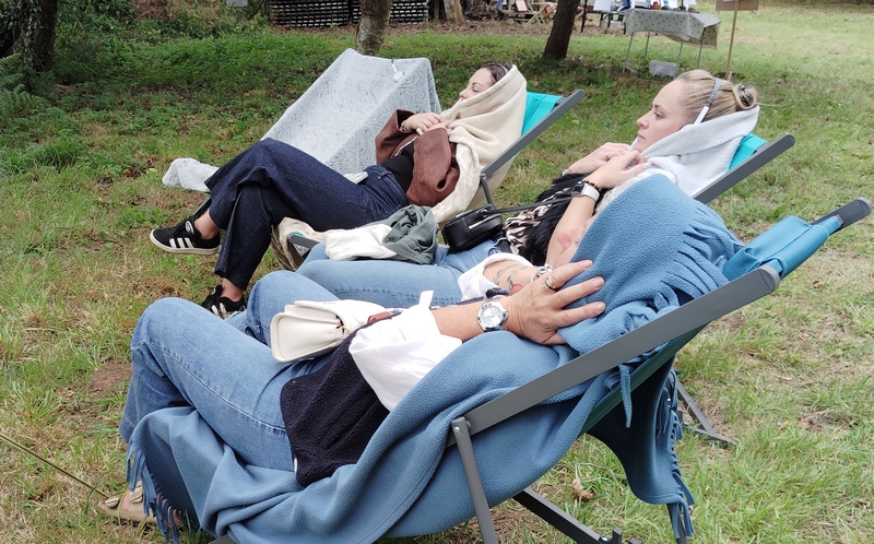 - Le troisième, Rêve à Sons, était extra ! Des bruits en forêt entendus au casque, des chaises longues et des couvertures confortables, la verdure devant soi, un lieu relaxant. Souvent les visiteurs fermaient les yeux, ils se sont détendus et demeuraient silencieux.
