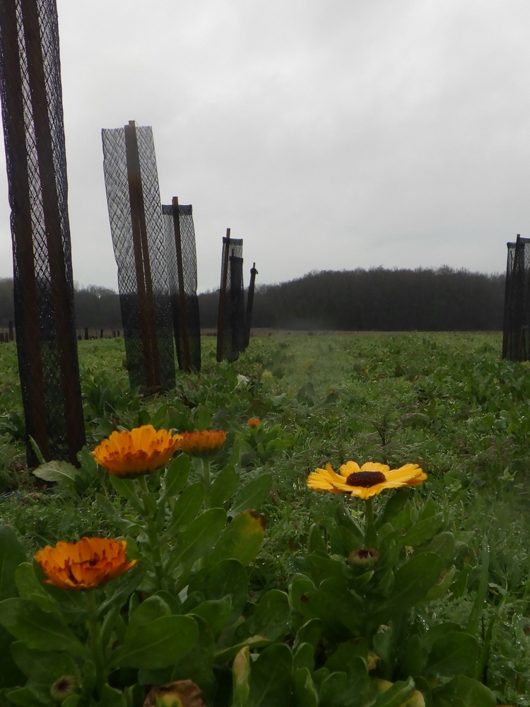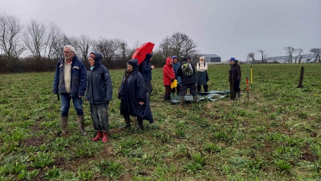 Sur ce sol limoneux plutôt basique, peu profond, nous y observons peu de graminées, peu de trèfles. La picride fausse-vipérine (Helminthotheca echioides) domine l’espace. Mais Olivier B., l’animateur du groupe, attire l’attention sur les caractéristiques et fonctionnements de ces plantes, notamment l’emprise racinaire. Une dizaine est échantillonnée pour comprendre les principales stratégies des plantes. La haie bordante permet aussi  de voir comment les arbres passent l’hiver, préparent leurs bourgeons. Des bénévoles de Bretagne Vivante ont déjà participé aux plantations, font des animations publiques pour faire connaitre l’exploitation. Mais ce n’est qu’un début, puisque Camille partage pleinement le désir d’améliorer la biodiversité. Son engagement auprès de Paysan de Nature et l’accompagnement de Bretagne Vivante vont certainement permettre de belles animations et quelques chantiers.