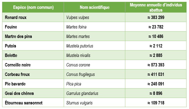 Au total, plus de 12 millions d’animaux ont été éliminés en sept ans dans les dix espèces étudiées (renard, martres, belettes, corneilles, corbeaux freux, pies, geais, étourneaux…).