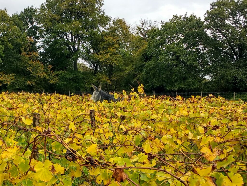 Chaque pied est unique, obtenu par sélection massale. Les rangs sont serrés, un tracteur ne passerait pas. Les ânes semblent se promener librement dans la vigne (spectacle rare !), ils participent à l’élimination des adventices.
