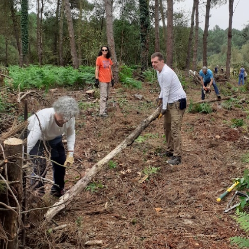 | | Les jours raccourcissent et la fraîcheur s’installe doucement sur les Grandes Landes. Les fougères se teintent de roux, la molinie dore le sol et les arbres commencent à perdre leurs feuilles, dessinant un paysage tout en nuances. Loin d’être triste, la lande entre simplement dans son repos d’hiver, prête à se régénérer. Pendant ce temps, les bénévoles s’activent : la clôture s’achève, les sentiers se préparent à accueillir la pluie, et déjà se dessinent les projets pour le printemps prochain. |