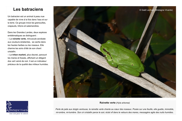 Catherine Demay et Gaël Lechapt, photographes amateurs de l’antenne Rance-Émeraude ont offert quelques unes de leurs photos pour créer des bâches grand format (80 × 120 cm), installées en septembre le long du chemin d’enceinte. Elles offrent aux promeneurs un aperçu sensible de la richesse faunistique et floristique des Grandes Landes : rainette, orvet, libellule, mésange ou encore grassette du Portugal s’y dévoilent grandeur nature. Une exposition simple qui fait le lien entre art, nature et engagement bénévole... et qui sera remise en place dès le printemps prochain ! |